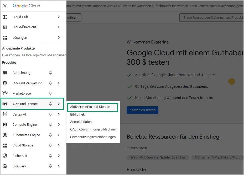 - Öffne oben links in der Ecke die Sidebar und navigiere zu “APIs und Dienste” > “Aktivierte APIs und Dienste”