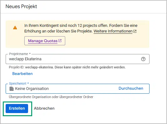 - Wähle einen Namen für dein Projekt und für deine Organisation und bestätige den Vorgang mit dem Button “Erstellen”
