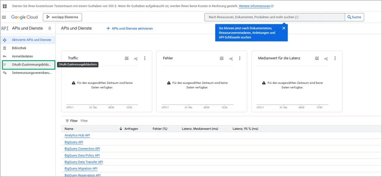 Nachdem du alle gewünschten APIs aktiviert hast, kanns du mit der Erstellung des OAuth Zustimmungsbildschirms fortfahren.