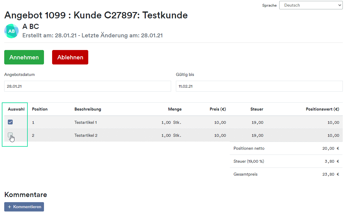 - Bei Annahme eines Angebots über den öffentlichen Angebotslink hat der Kunde die Möglichkeit, einzelne Positionen anzuwählen, welche angenommen werden.