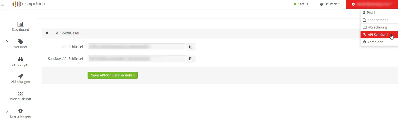 Logge dich bei Shipcloud ein http://www.shipcloud.io und gehe oben Rechts auf deinen Benutzernamen (E-Mail) und wähle API-SCHLÜSSEL. Wenn nicht bereits geschehen, erstelle einen neuen API-Schlüssel & kopiere diesen in die Zwischenablage.